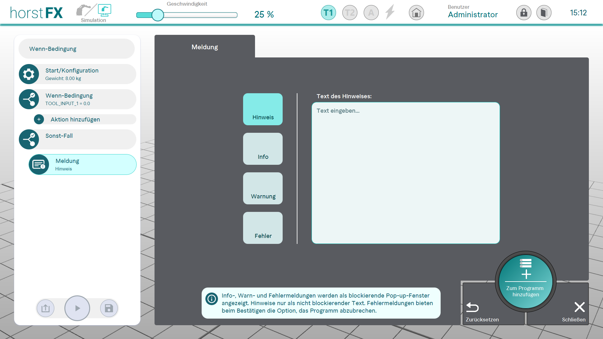 Die Aktion Meldung wird verwendet, um während der Programmausführung eine Meldung am Bedienpanel anzuzeigen. Dadurch kann der Benutzer auf bestimmte Situationen hingewiesen oder es können ihm zusätzliche Informationen angezeigt werden.