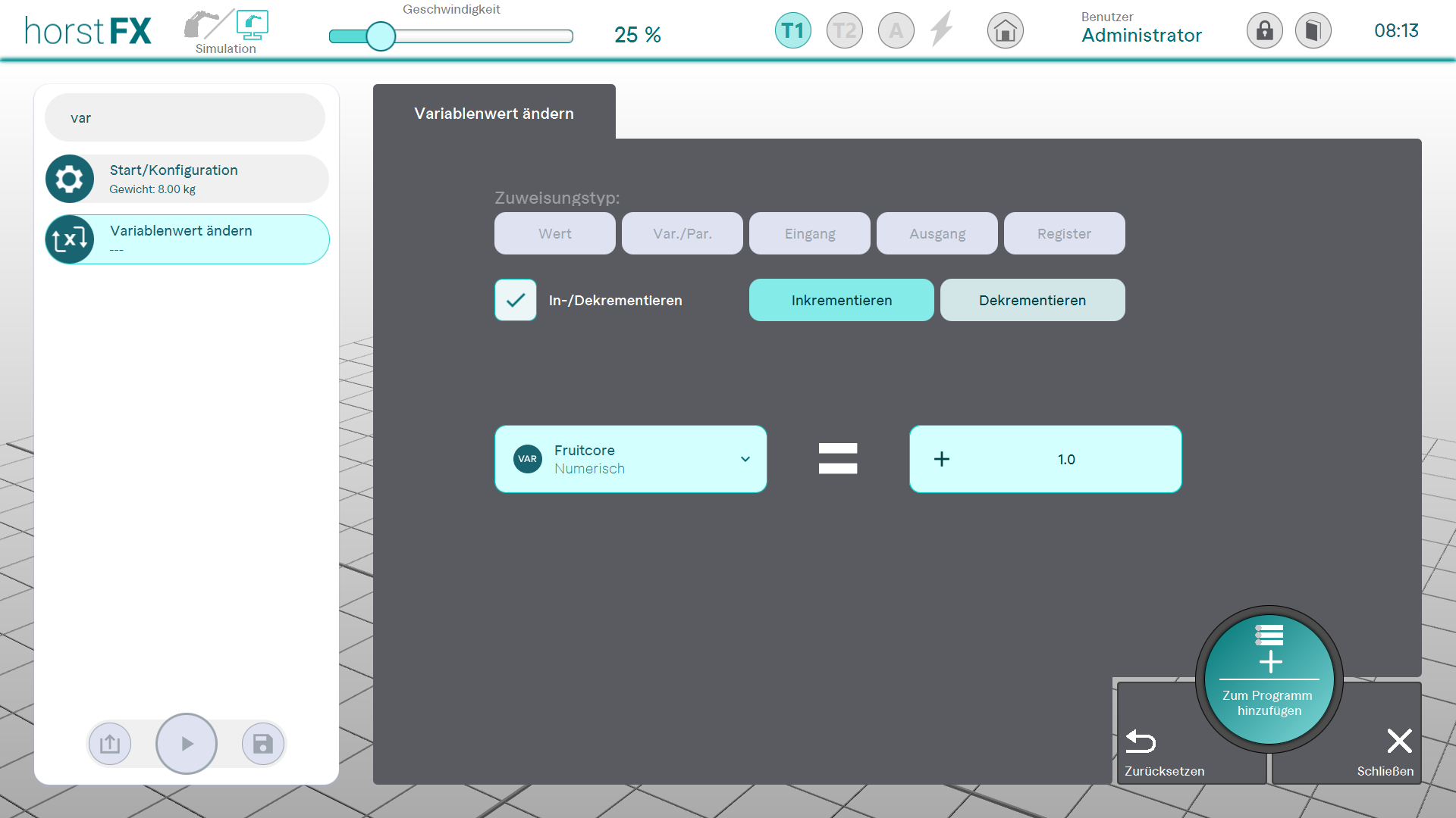 Numerische Variablen können in- bzw. dekrementiert werden. Mit jeder Ausführung der Aktion wird der aktuelle Variablenwert um den angegebenen Wert erhöht bzw. verringert. Folglich macht das In-/Dekrementieren am meisten Sinn, wenn es innerhalb von Schleifen verwendet wird.