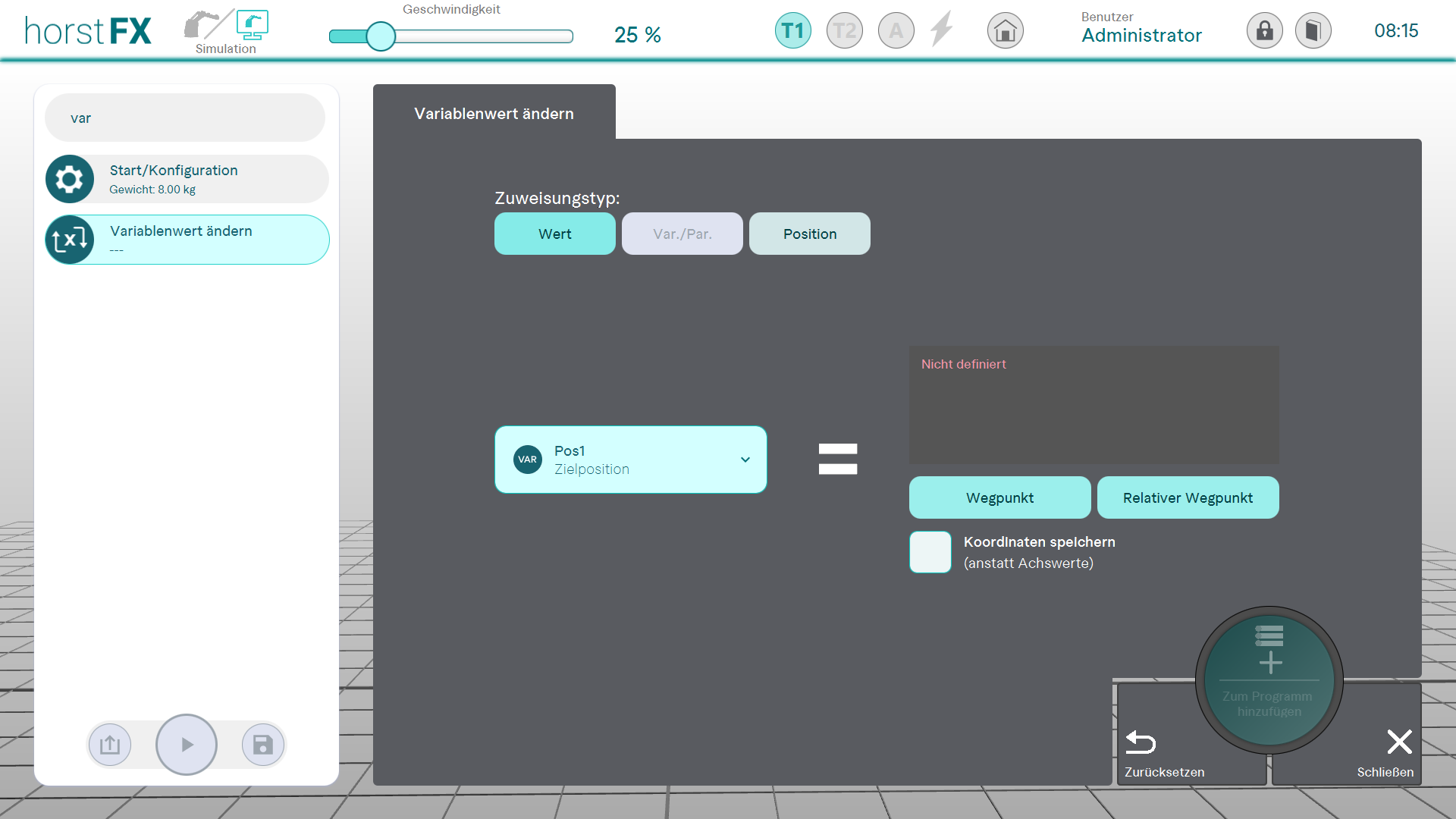 Der Wert einer Zielposition-Variable wird standardmäßig in Form von Achswerten definiert. Optional kann dies in Form von Koordinaten mit Orientierung erfolgen, wenn dies für die weitere Verwendung der Variable vonnöten sein sollte.