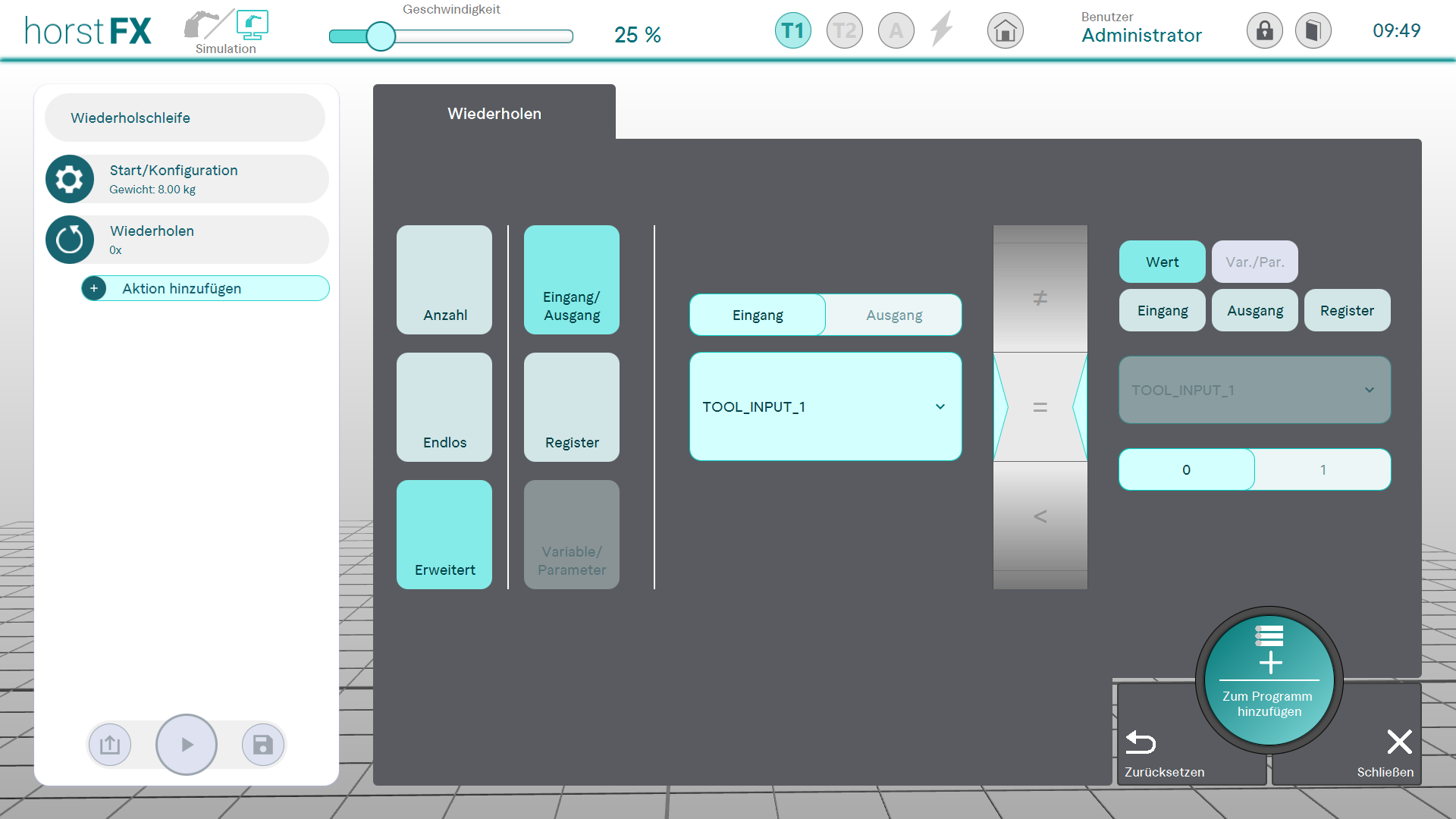 Es kann entweder eine bestimmte Anzahl an Wiederholungen (Schleifendurchläufe) eingestellt, eine Endlos-Schleife ausgewählt oder eine Bedingung zu einem Eingang, zu einer Variablen oder einem Ausgang festgelegt werden.