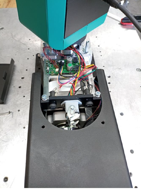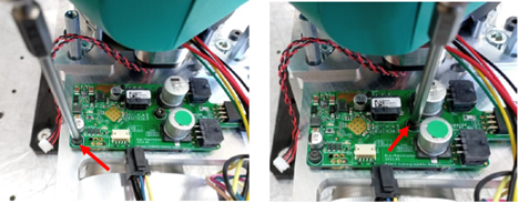 6.) Lösen Sie die Schrauben des Motortreibers (TX10) mit einem passenden Werkzeug. Beachten Sie, dass die Schrauben durch Abstandshalter gesichert sind und sich nicht vom Motortreiber trennen lassen.