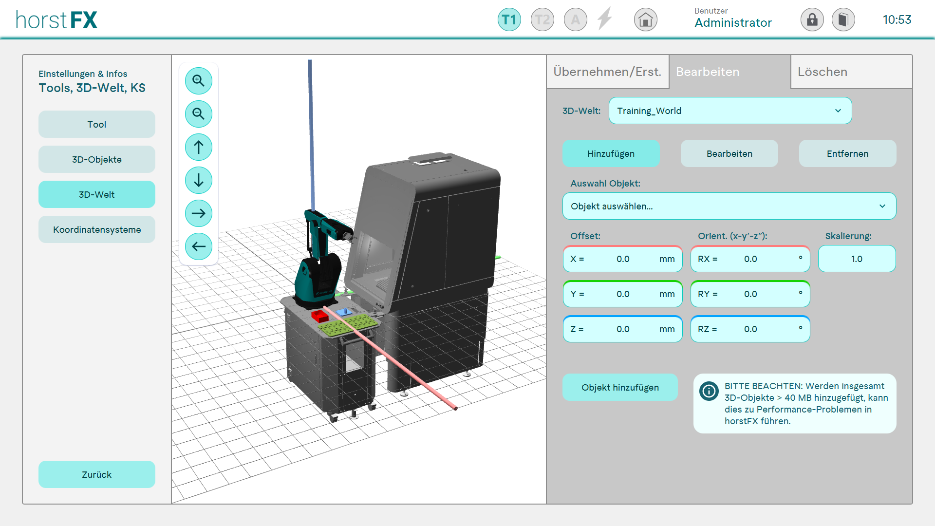 In einer 3D-Welt können mehrere zuvor importierte 3D-Objekte beliebig angeordnet und als eine Konfiguration gespeichert werden. Somit kann die Arbeitsumgebung des Roboters abgebildet werden.