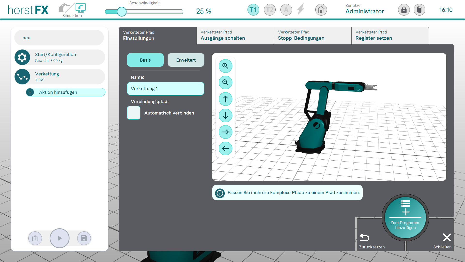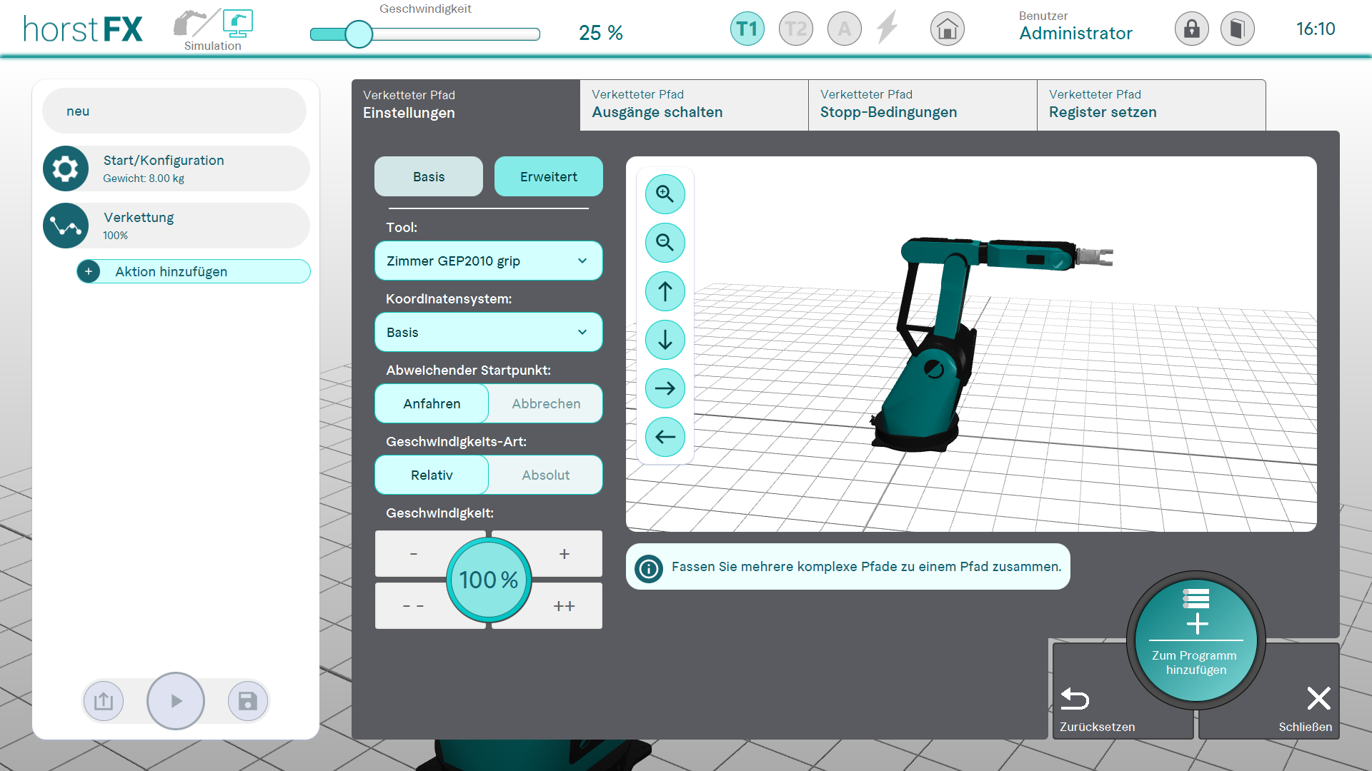 Hier kann zus�tzlich das Tool und das Koordinatensystem eingestellt werden. Au�erdem kann das Verhalten festgelegt werden im Falle eines abweichenden Startpunkts, Abbruch oder Anfahren.