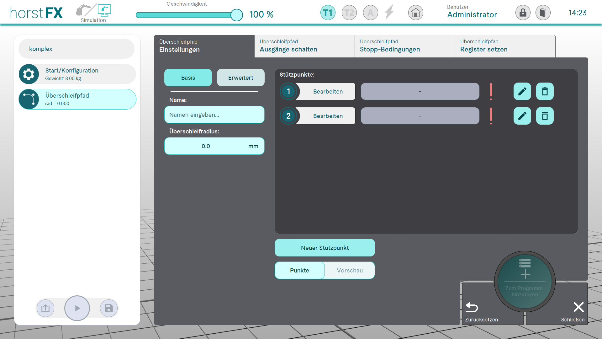 Im Reiter Einstellungen k�nnen die St�tzpunkte definiert werden, ebenso wie der f�r alle g�ltige �berschleifradius.