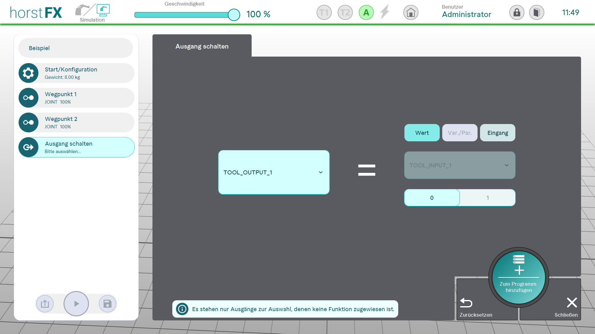 Mit der Aktion Ausgang Schalten k�nnen Vorg�nge an Anbauteilen/Tools (z. B. Greifer) ausgel�st oder Informationen an andere mit dem Robotersystem verbundene Maschinen weitergeleitet werden.