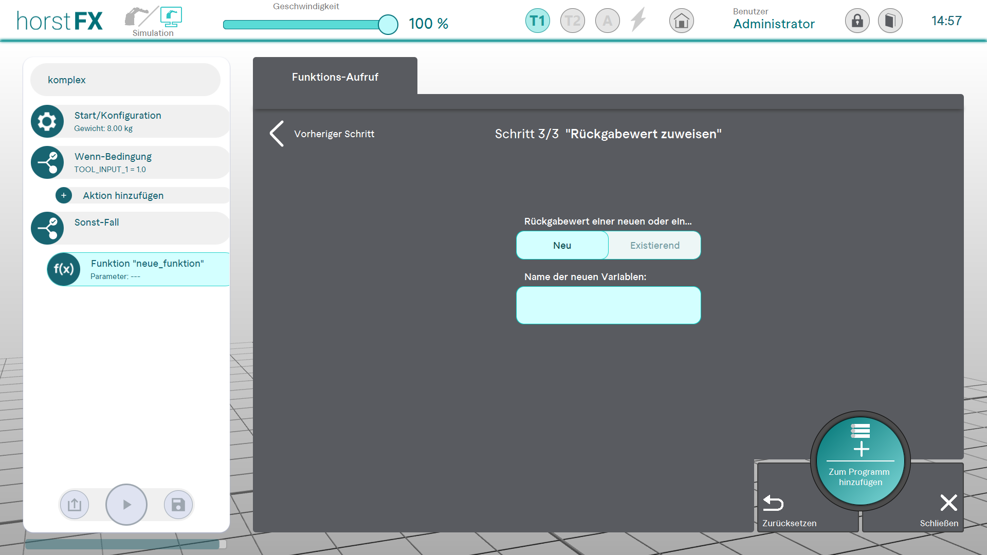 Im letzten Schritt wird festgelegt, ob der R�ckgabewert der Funktion einer neuen oder einer bestehenden Variablen zugewiesen wird. Wird die Option Neu gew�hlt, muss ein g�ltiger Variablenname eingegeben werden, bei der Option Existierend muss eine bereits bestehende Variable ausgew�hlt werden.