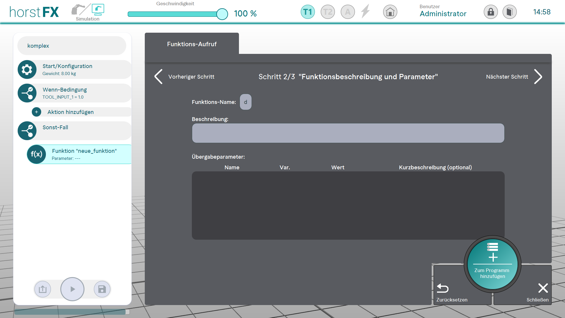 Im zweiten Schritt werden genauere Informationen zur ausgew�hlten Funktion angezeigt. Es werden die Parameter aufgelistet, die in der Funktion definiert wurden. Der Wert der Parameter entspricht dabei dem jeweiligen Standardwert und kann hier ver�ndert werden. Alternativ kann hier eine Variable ausgew�hlt werden, deren Wert als Parameterwert �bernommen wird. Diese Parameterwerte werden der Funktion beim Aufruf �bergeben.