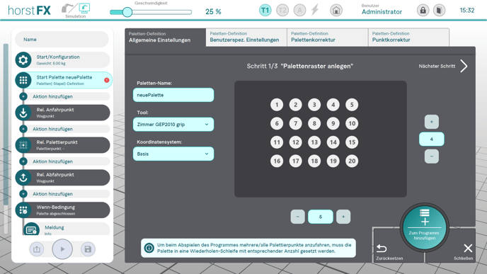 Eine Palette muss in eine Wiederholschleife (Anzahl Wiederholungen = Anzahl Palettierpunkte) gelegt werden, damit alle Punkte bearbeitet werden.
