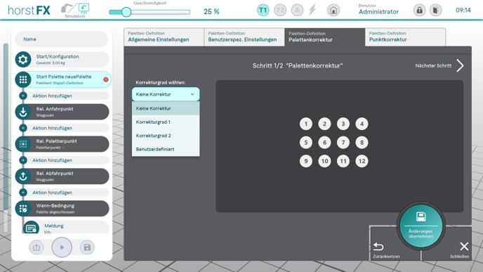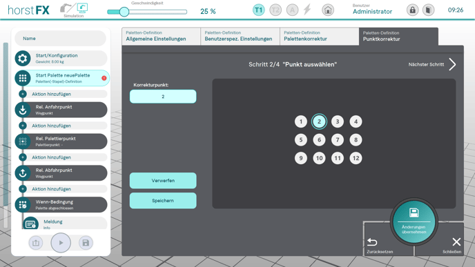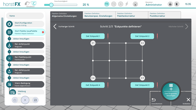 Danach werden die Eckpunkte der Palette definiert. Dies geschieht analog zum Freien Fahren.
