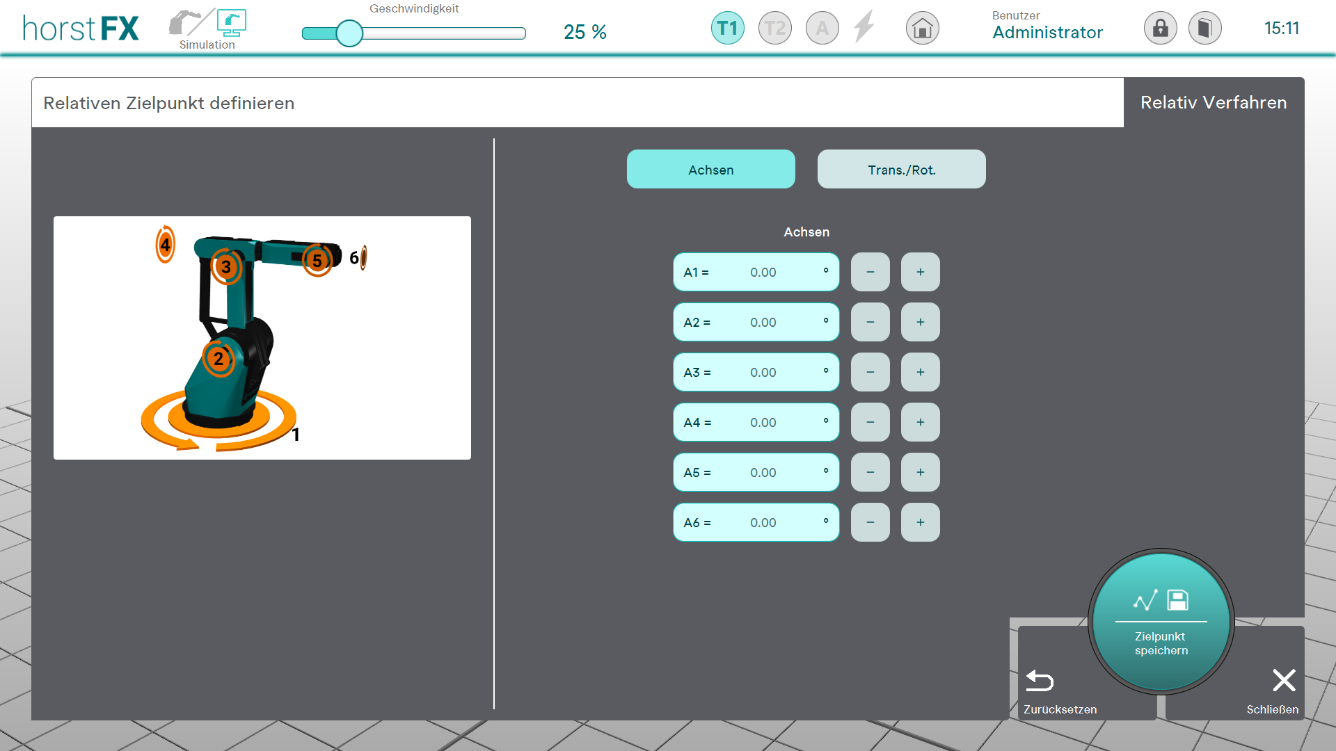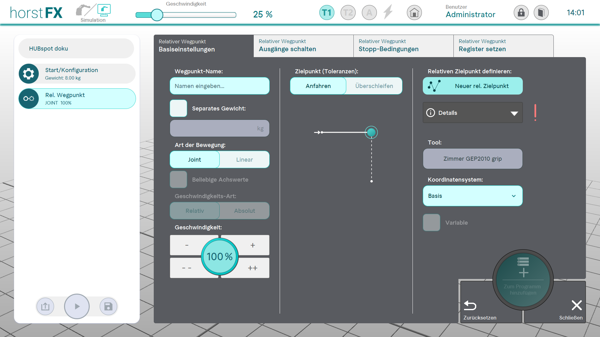 Eine Aktion Relativer Wegpunkt stellt die Definition einer Bewegung des Roboters in eine bestimmte Stellung bzw. zu einem bestimmten Zielpunkt dar. Der Zielpunkt wird jedoch relativ zur vorherigen Stellung des Roboters definiert.