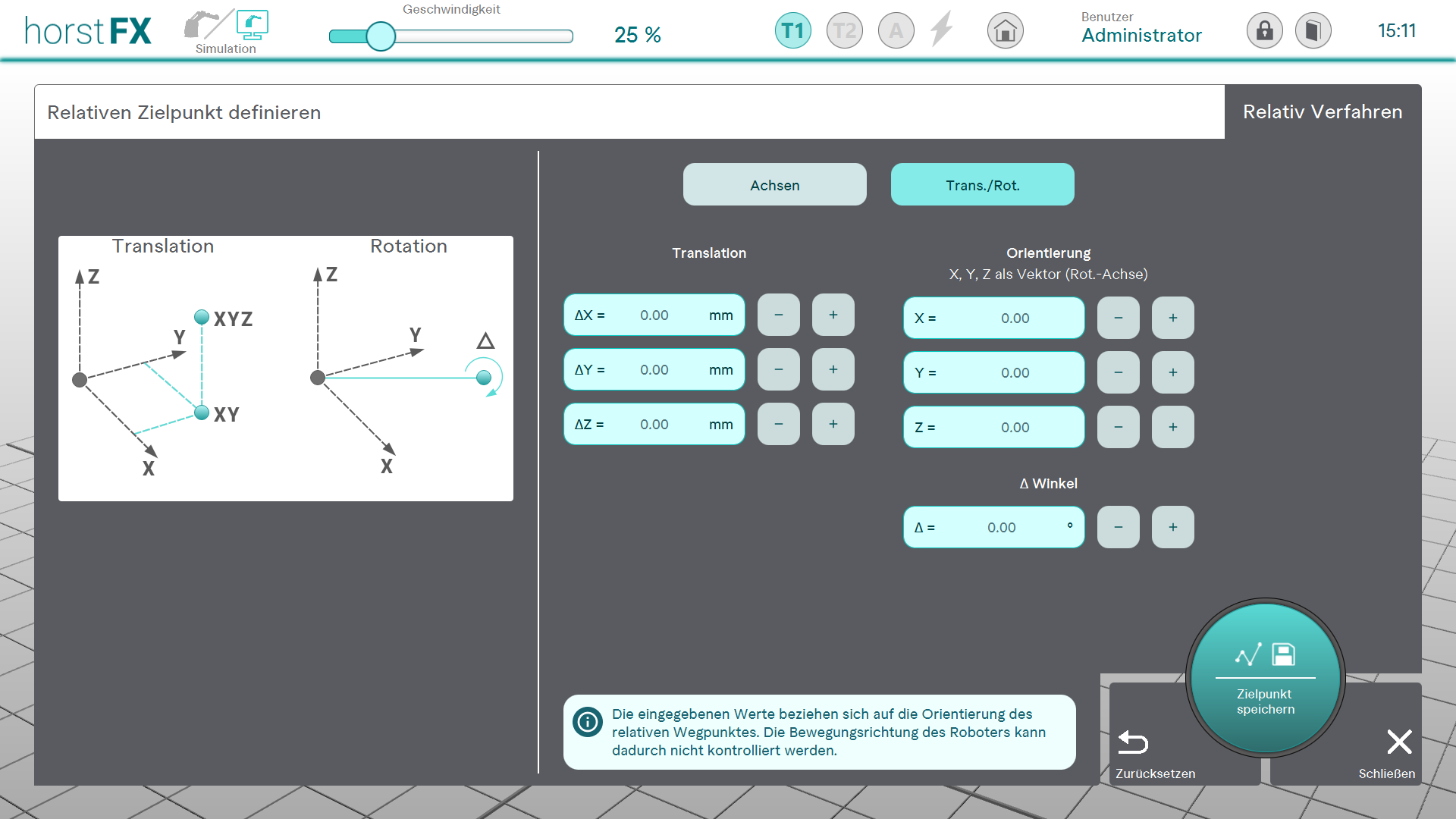 Translation und Rotation k�nnen sowohl einzeln als auch in Kombination definiert werden. Als Bezugs-Koordinatensystem kann sowohl das Basis-Koordinatensystem als auch das TCP-Koordinatensystem ausgew�hlt werden.