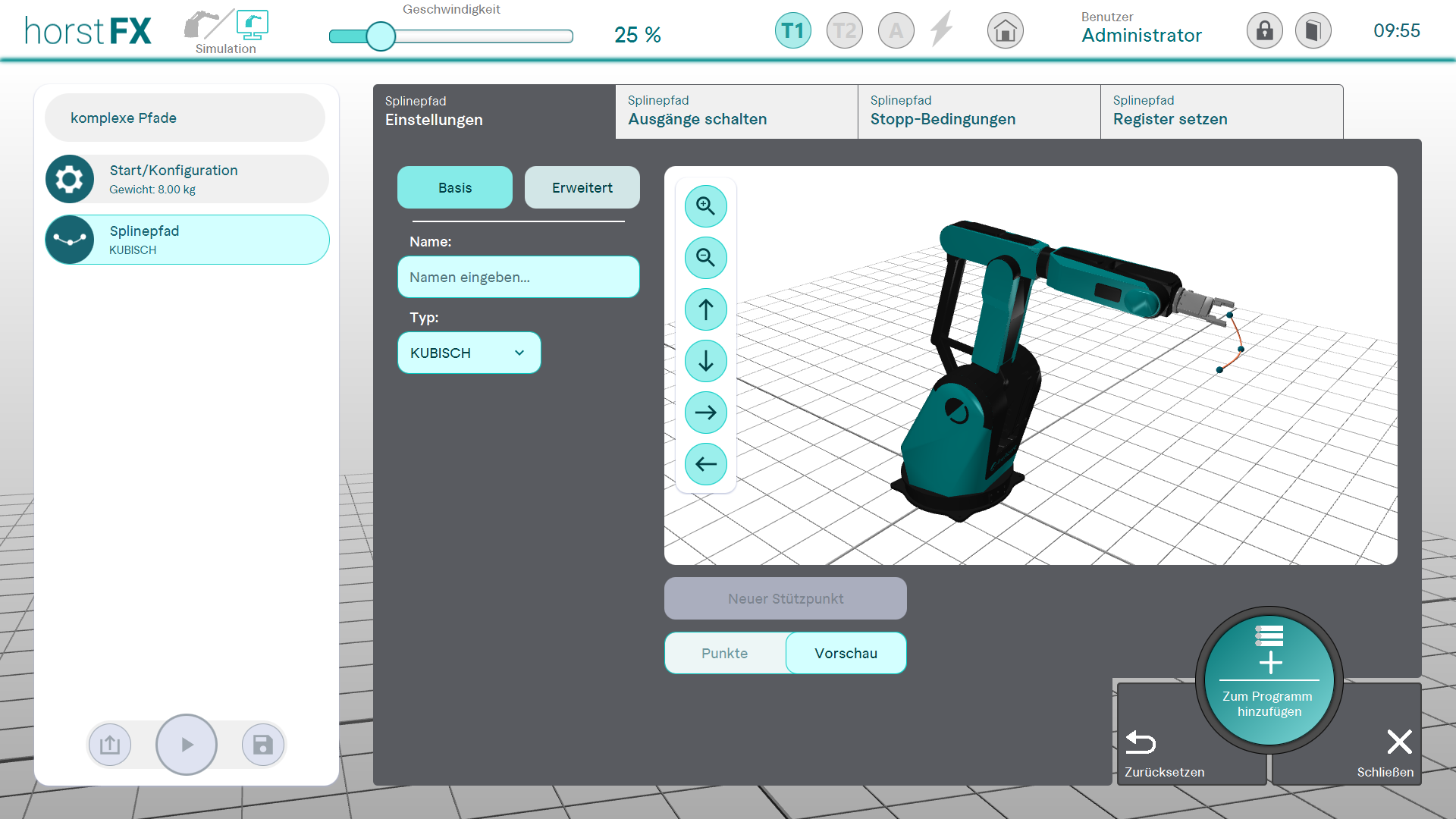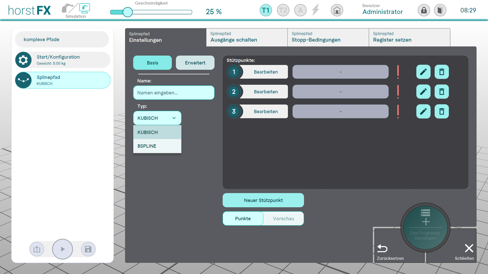 Mit der Aktion Splinepfad ist es m�glich eine Bewegung anhand einer definierten Kurve auszuf�hren, dies ist unter anderem f�r die Vermeidung von Kollisionen oder f�r z.B. Klebeanwendungen vorteilhaft.