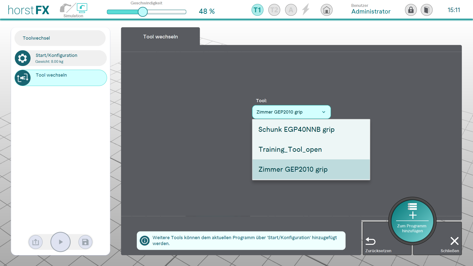 Die Aktion Tool wechseln bewirkt, das f�r alle nachfolgenden Aktionen das nun eingestellte Tool ausgew�hlt wird. Bei Aktionen, an denen ein Tool hinterlegt ist, wird weiterhin das dort definierte Tool genutzt.