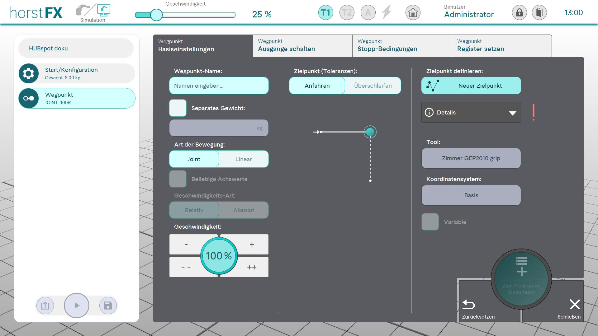 Ein Wegpunkt stellt die Definition einer Bewegung des Roboters in eine bestimmte Stellung bzw. zu einem bestimmten Zielpunkt dar. Es werden u. a. Geschwindigkeit, Art der Bewegung, Toleranzen (�berschleifen) und Zielpunkt des Roboters festgelegt. Der Zielpunkt definiert die gew�nschte Pose (Stellung) des Roboters.