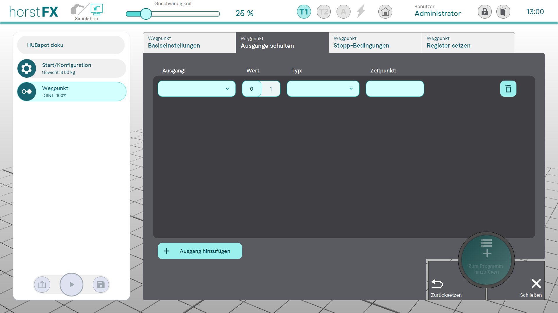 In diesem Teil der Einstellungen k�nnen w�hrend des Anfahrens eines Wegpunktes Register gesetzt werden. Das bedeutet, dass Werte zu einem bestimmten Zeitpunkt w�hrend der Bewegung des Roboters in ein Register gesetzt werden k�nnen. F�r jede Aktion Wegpunkt k�nnen beliebig viele Register gesetzt werden.