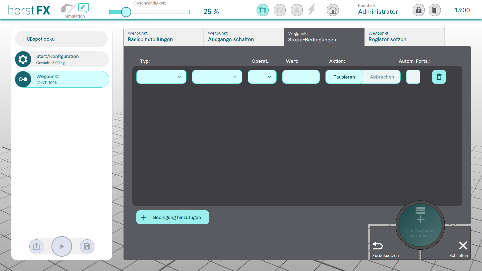 Durch Stopp-Bedingungen k�nnen Bewegungen zu einem Wegpunkt pausiert oder abgebrochen werden, sobald eine bestimmte Bedingung eintrifft. F�r jede Aktion Wegpunkt k�nnen beliebig viele Stopp-Bedingungen definiert werden.