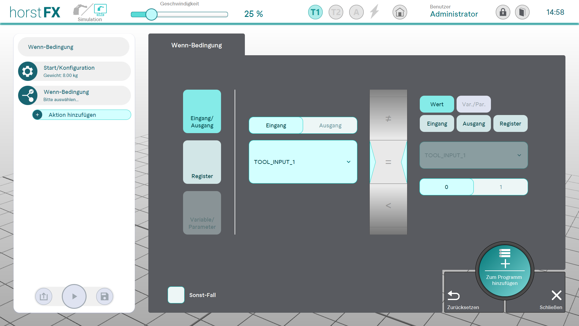 Um eine Bedingung festzulegen, muss immer ein Eingang, eine Variable oder ein Ausgang, ein Operator und ein Wert eingestellt werden. Als Wert kann hierbei zwischen einem Eingang, einer Variablen, einem Register oder einem Ausgang gew�hlt werden. Zudem k�nnen f�r Ein- und Ausg�nge die Werte 0 und 1 (false/true) sowie f�r Variablen beliebige numerische Werte gew�hlt werden.