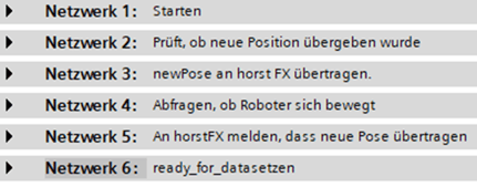 Hier wird �berpr�ft. ob die zuletzt �bergeben Pose von horstFX eingelesen wurde (#new_pose=false). Ist dies der Fall, wird die Ausgangsvariable #ready_for_data gesetzt. Jetzt k�nnen neue Posen von der SPS �bergeben werden, auch schon w�hrend sich der Roboter zur zuletzt �bergebenen Pose bewegt.