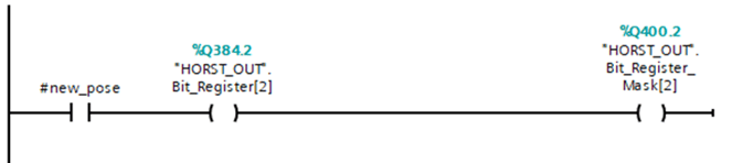 Hier wird �berpr�ft, ob die anliegende Pose an CONTROL �bergeben wurde und ob sich der Roboter bewegt (#is_moving). Dazu wird ein Bool Register auf CONTROL ausgelesen ("HORST_IN".Bool_Tegister[1]), das in horstFX nach dem Einlesen der Pose und vor dem Start der Bewegung gesetzt wird. Ist dieses Statusbit gesetzt, wird #new_pose zur�ckgesetzt und #is_moving gesetzt. Beim erreichen der Pose wird das Statusbit in horstFX zur�ckgesetzt und somit der SPS gemeldet, dass die Pose erreicht wurde (#is_moving=false).