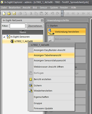 Mittels dem Spreadsheet kann die Kamera als Alternative zu dem EasyBuilder in dem In-Sight Explorer konfiguriert werden. Diese Variante erfordert eine etwas st�rkere Einarbeitung, jedoch sind die M�glichkeit im Vergleich zu dem EasyBuilder gr��er.