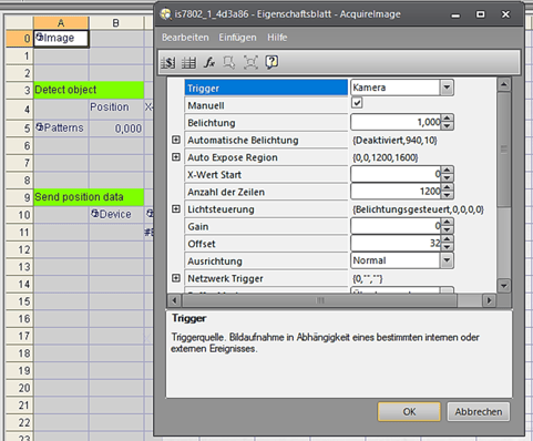 Bei dem Anlegen eines neuen Projekts wird standardm��ig in Zelle A0 ein Image Objekt erstellt. Mittels Doppelklick auf diese Zelle k�nnen Grundlegende Einstellungen zur Bildaufnahme ausgew�hlt werden. Ist bei dem Listenfeld Trigger Kamera ausgew�hlt, kann durch eine Verdrahtung der digitalen Triggerdrahtleitung der Kamera, �ber das Setzen eines digitalen Ausgangs des Roboters, eine Bildaufnahme an der Kamera ausgel�st werden.