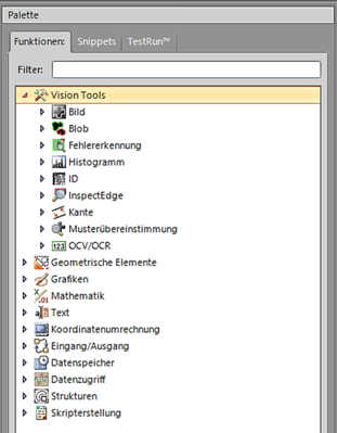 In dem Fenster Palette finden sich Funktionen zur Steuerung der Kamera die man in die Tabelle hinzuf�gen kann. Unter den Vision Tools befinden sich Funktionen um Objekte einzulernen bzw. zu �berpr�fen. Per drag and drop kann die gew�nschte Aktion in die Tabelle gezogen und anschlie�end mittels Doppelklick darauf parametriert werden.