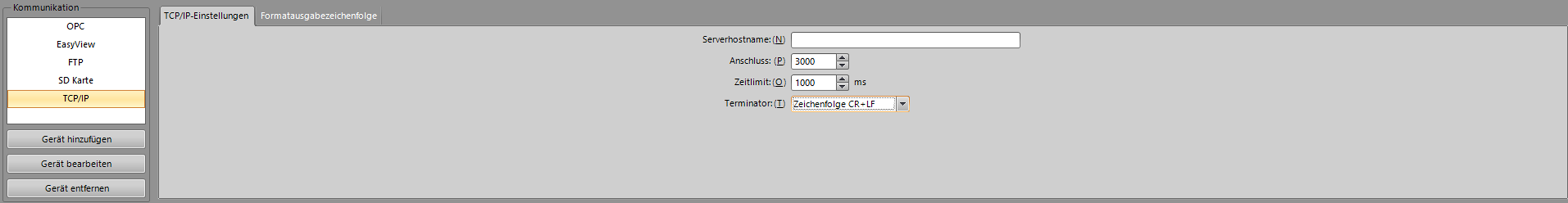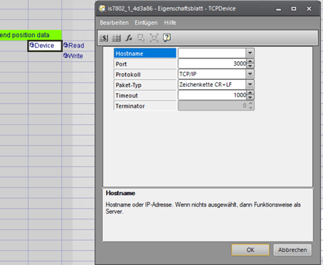 Zur Einrichtung der Kommunikation �ber einen TCP/IP Socket wird zun�chst ein TCPDevice hinzugef�gt. Dieses findet man in dem Fenster Palette unter den Funktionen Eingang/Ausgang ? Netzwerk ? TCPDevice. Nach dem Hinzuf�gen wird dieses par Doppelklick parametriert. Wird das Feld Hostname leer gelassen, agiert die Kamera als Server. Die eingestellte Zeit in dem Feld Timeout wird in diesem Falle nicht weiter betrachtet. Als Protokoll wird TCP/IP ausgew�hlt.