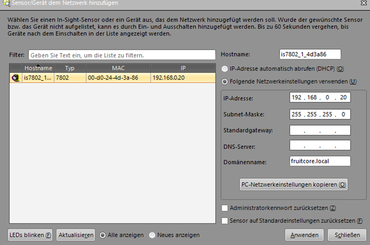 Die IP-Adresse der Kamera kann in dem In-Sight Explorer eingestellt werden.