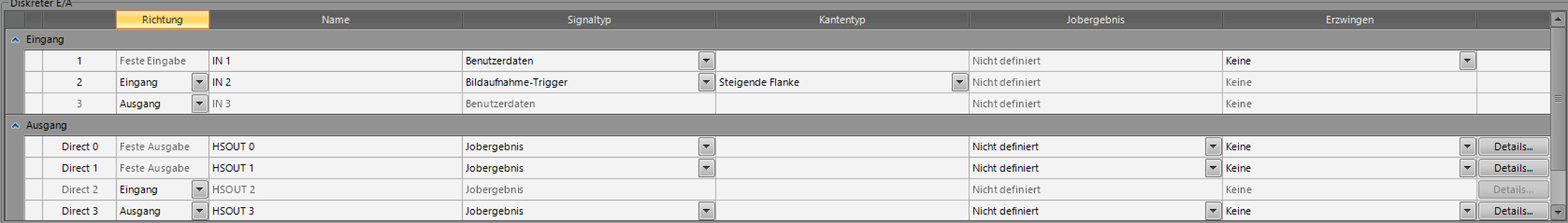 In dem Men� "Bild einrichten" k�nnen grundlegende Aufnahmeeinstellungen bearbeitet werden. Soll der Trigger digital erfolgen, muss bei dem Feld "Trigger" "Extern" ausgew�hlt werden. Anschlie�end muss unter dem Men� "Eing�nge / Ausg�nge" ein Eingang so konfiguriert werden, dass bei einer steigenden Flanke der Bildaufnahme-Trigger ausgel�st wird.