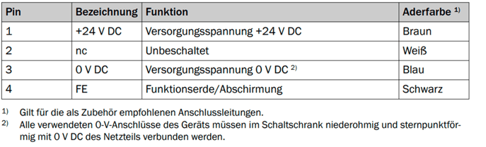 Die Zuordnung von Pin, Bezeichnung, Funktion und Aderfarbe kann aus der Anschlusstabelle entnommen werden (siehe nachfolgende Tabelle). Dies setzt die Verwendung der Standardkabel von SICK (Typ: YN2A1D-100UV1XLEAX, Art-Nr.:2118011, https://www.sick.com/de/de/yn2a1d-100uv1xleax/p/p671027) voraus.