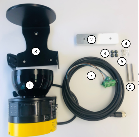 Dem Laserscanner sind noch zwei Befestigungss�tze beigef�gt, ein Distanzhalter und eine Halterung f�r das Mounting Kit1B als Schutzumhausung f�r den Laserscanner. Die technische Dokumentation und Ma�e finden Sie auf der Webseite www.sick.de unter der Bezeichnung �Befestigungssatz 1b � ist unter Bestellnummer 2074242 hinterlegt.