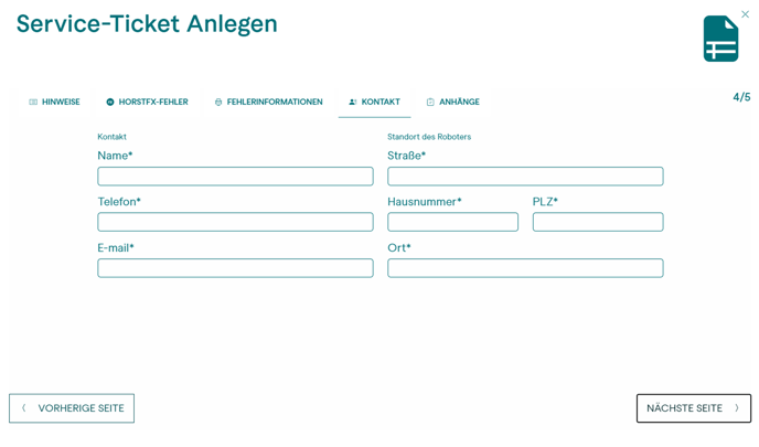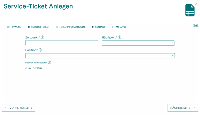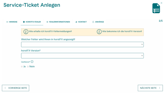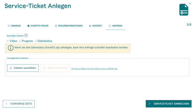 10. Auf der f�nften und letzten Seite des Formulars k�nnen Sie Dateien wie ein Video von der Applikation und dem auftretenden Fehler, Fotos der Anlage oder einen Status Export von horstFX anh�ngen. Je mehr Informationen Sie zu Ihrem Problem bereitstellen, desto einfacher und schneller kann Ihr Serviceticket bearbeitet werden.