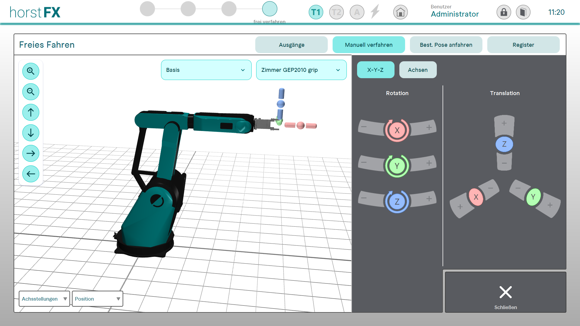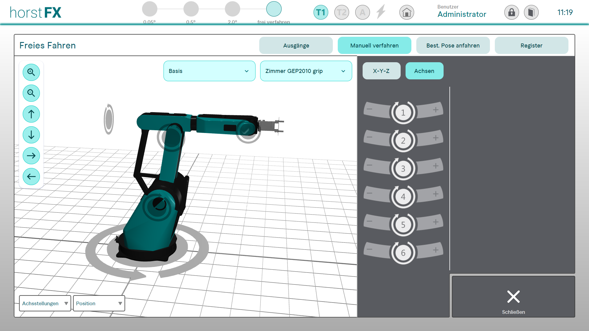 Es kann um einzelne Achsen rotiert werden. Dabei bleibt der TCP immer an der selben Stelle, der Roboter rotiert um ihn herum.