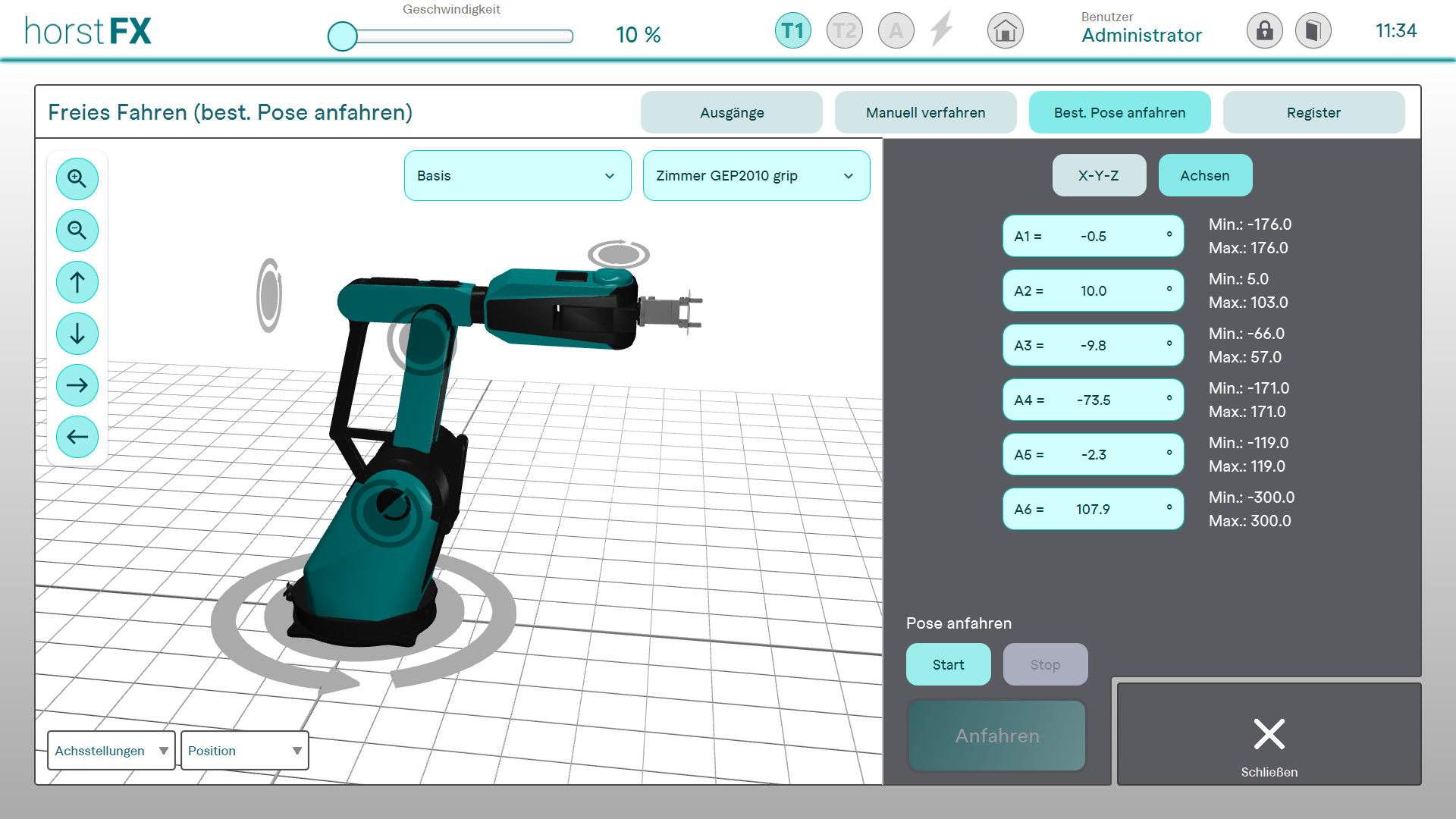 Eine bestimmte Roboter-Pose kann entweder durch eine vorgegebene Orientierung (Bild 1) durch Koordinaten oder anhand einer Achse (Bild 2) des globalen Koordinatensystems definiert werden. Sobald die gew�nschte Pose durch die entsprechenden Werte definiert wurde, wird �ber das Netzmodell des Roboters die potentiellen Achstellungen angezeigt. Um diese Achskonfiguration tats�chlich anzufahren muss zun�chst auf "Start" gedr�ckt werden und anschlie�end auf "Anfahren". Der Button "Anfahren" muss gehalten werden, damit der Roboter sich in die entsprechende Pose bewegt. Hierbei m�ssen der automatische Bewegungsablauf und m�gliche Kollisionen beachtet werden.