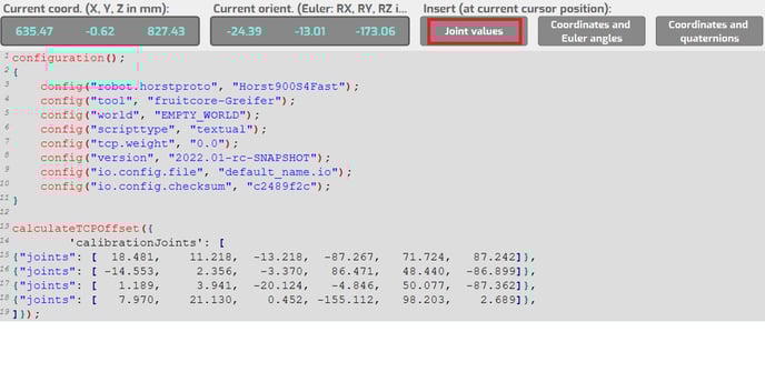 Die vier/f�nf Gelenkkonfigurationen werden an die Funktion 'calculateTCPOffset()' �bergeben. Diese k�nnen von der aktuellen Roboterposition �ber die Schaltfl�che 'Gelenkwerte' �bernommen werden.