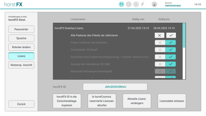 Im Men� Lizenz ist die aktuell aktivierte Lizenz von horstFX ersichtlich und es kann ein Lizenzschl�ssel eingegeben werden, um eine andere Lizenz zu aktivieren.