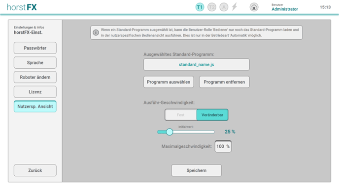Die Nutzerspezifische Bedienansicht ist eine vereinfachte Ansicht die sich auf die Bedienung der laufenden Anwendung konzentriert. In ihr kann ein Programm ausgew�hlt werden, welches standardm��ig in dieser f�r die Bedienung optimierten Ansicht angezeigt wird. Weiterhin kann eingestellt werden, ob das Bedienpersonal die Programmgeschwindigkeit ver�ndern darf.