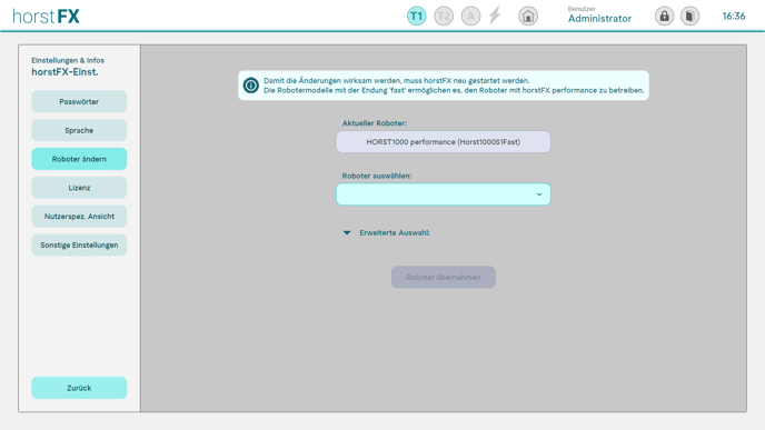 Standardm��ig sind in horstFX keine Passw�rter f�r die Benutzer-Rollen vergeben. Beim Starten von horstFX wird automatisch die Benutzer-Rolle Administrator angemeldet. Nur �ber diese Benutzer-Rolle k�nnen die anderen beiden Standard-Benutzer-Rollen Programmierer und Bediener freigeschaltet und ein Passwort f�r sie vergeben werden. Dies ist jedoch erst m�glich, sobald f�r die Benutzer-Rolle Administrator selbst ein Passwort vergeben ist. Das Freischalten und die Passwort-Vergabe kann unter Einstellungen > Passw�rter erledigt werden.