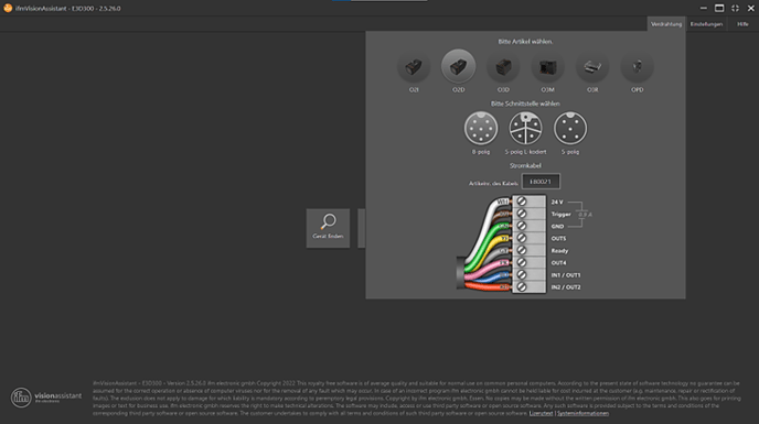 F�r die meisten Pr�faufgaben wird die digitale Kommunikation ausreichend sein. In dem ifm Vission Assistant kann zur Hilfe der Verdrahtung eine passende �bersicht zu dem jeweiligen Anschlusskabel aufgerufen werden.