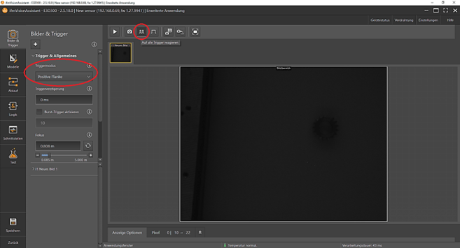 Um den Sensor digital zu Triggern, muss im ifm Vission Assistant bei der Erstellung einer Anwendung der Triggermodus auf Positive Flanke eingestellt werden. Ebenso muss in dem Fenster der Button auf alle Trigger reagieren angew�hlt werden.