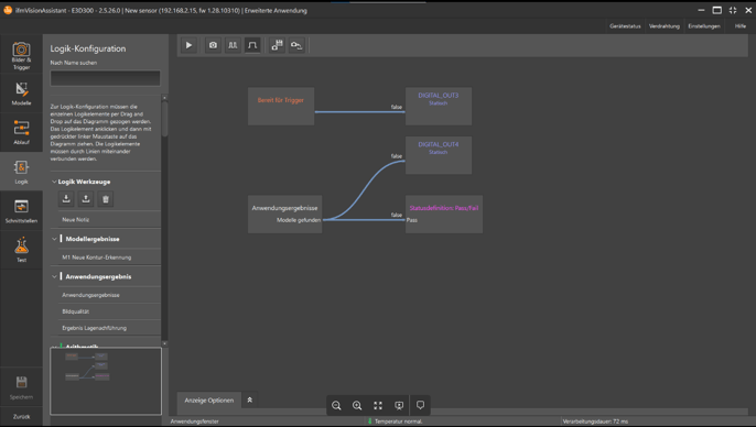 Im ifm Vission Assistant kann in dem Tab Logik eine Logik-Konfiguration erstellt werden. Die digitalen Ausg�nge k�nnen so mit den passenden Zust�nden belegt werden.