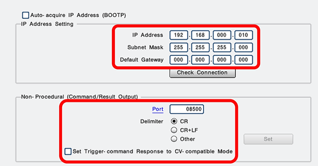 Eine genaue Beschreibung zum Einrichten des Kamerasystems ist im Anhang (Erkl�rung Inbetriebnahme.pdf) zu finden. Zu Kommunikation via TCP/IP, m�ssen sich HORST und der CV-X Controller im selben Netzwerk befinden. Die IP-Adresse des Controllers kann entweder manuell vergeben, oder via DHCP automatisch bezogen werden. Als Port muss 8500 eingestellt werden, das Trennzeichen (Delimiter) am Ende jedes Strings wird auf CR (Carriage Return) gesetzt.