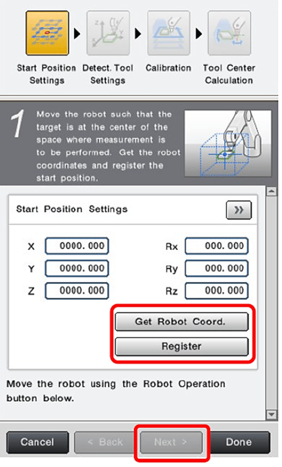 Die Matrix wird Punkt f�r Punkt manuell abgefahren, wobei die jeweiligen Jigg-Positionen von der Kamera erkannt und die zugeh�rigen Flansch-Koordinaten des Roboters in der Kamerasoftware eingegeben werden. Abschlie�end wird der Flanschmittelpunkt in Bezug zum Kalibrier-Jigg berechnet. Daf�r wird der Flansch um definierte (einstellbare) Winkel gekippt und von der Kamera erkannt. Durch Abgleich der �bergebenen und erkannten Winkel berechnet die Software die genaue Lage und Orientierung des Flanschmittelpunktes.