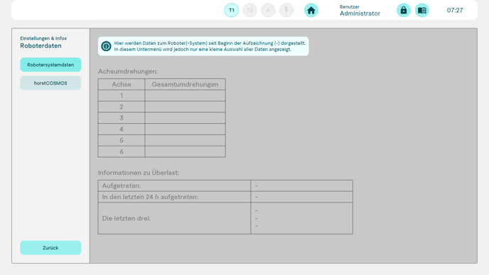 In den Robotersystemdaten werden Informationen �ber die Laufleistung der einzelnen Achsen angezeigt sowie �ber Fehler die zu einem Stopp nach Kategorie 1 gef�hrt haben.