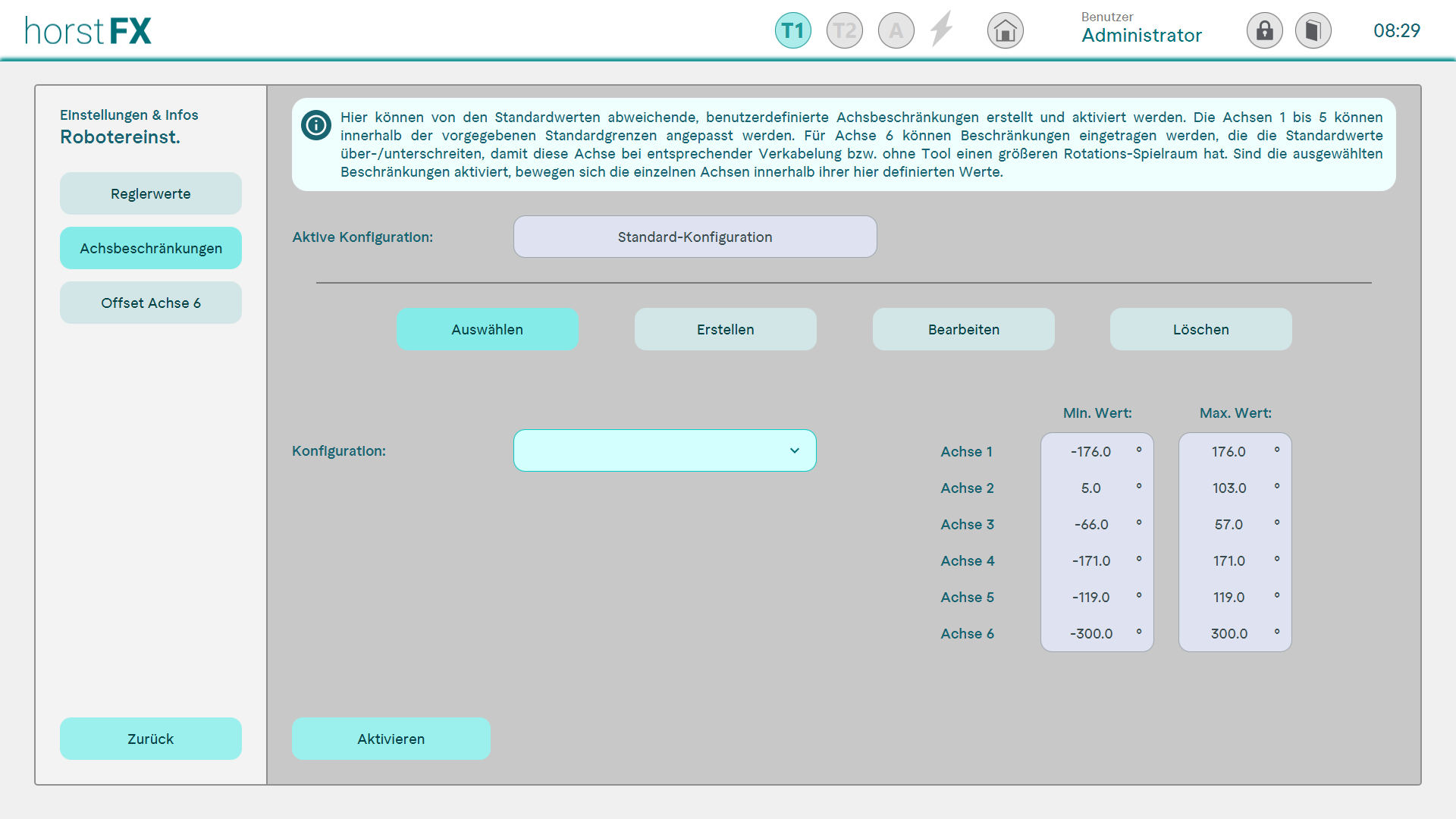 Hier kann der Bewegungsraum einzelner Achsen limitiert und als Konfiguration abgespeichert werden. Besonders k�nnte eine Einschr�nkung der Achsen 1, 2, und 3 sinnvoll sein, um Kollisionen mit z.B. der Schutzeinrichtung oder der Arbeitsfl�che zu vermeiden. Ebenso kann eine Limitierung der Achse 6 durch Kabel oder Leitungen des Endeffektors sinnvoll sein.