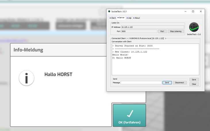 Es wird die Implementierung einer TCP/IP Kommunikation vorgestellt. Die Schnittstelle wird durch das Erstellen einer Socket-Verbindung realisiert. Hierf�r wird auf die Standardfunktionalit�ten von JavaScript (insb. StreamWriter) zur�ckgegriffen.