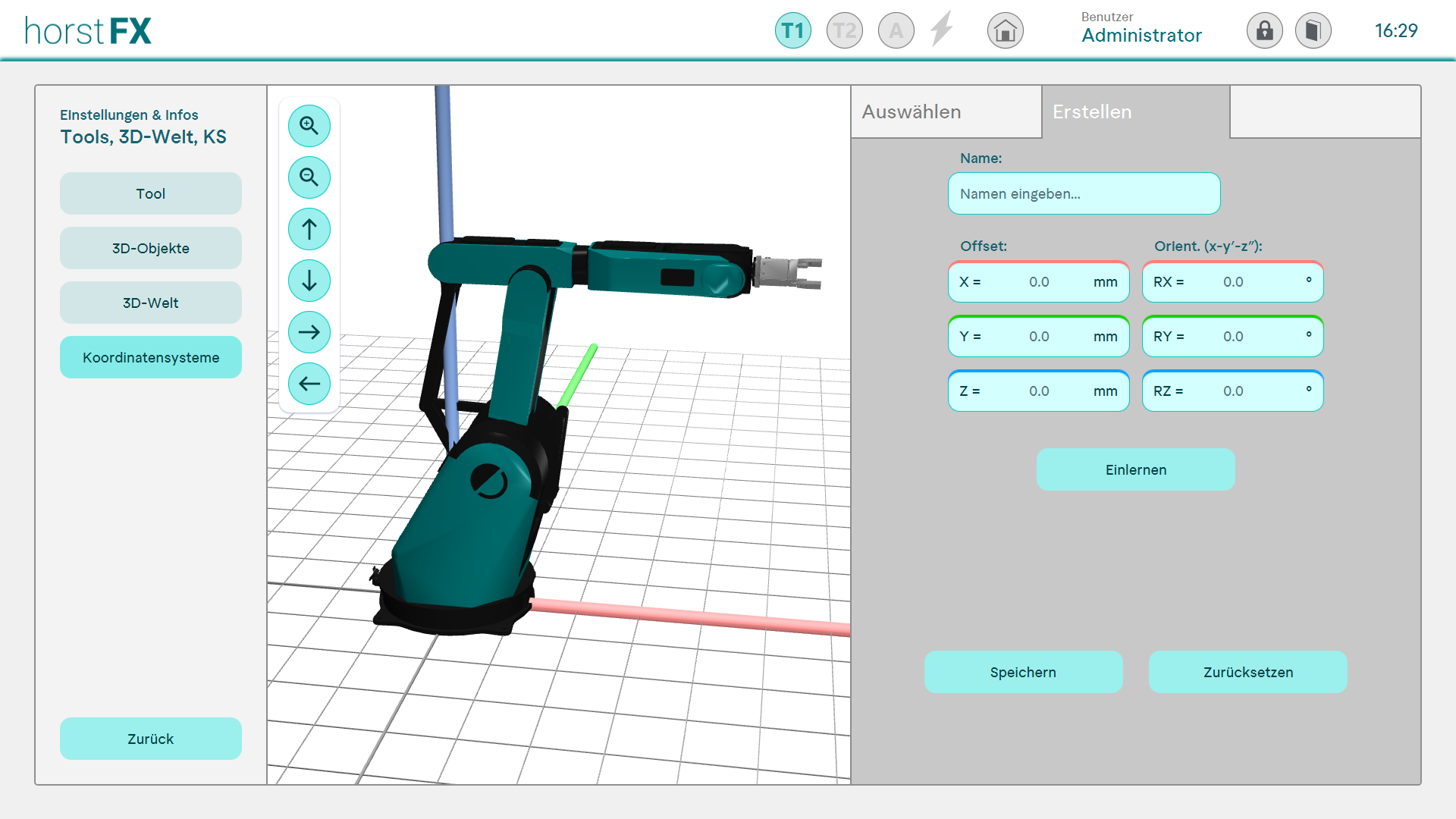 Das Erstellen eines Koordinatensystems erfolgt �ber die Angabe eines Offsets und einer Orientierung. Diese kann angegeben oder �ber das Anfahren von Punkten eingelernt werden. Nach der Erstellung ist eine Anpassung m�glich.
