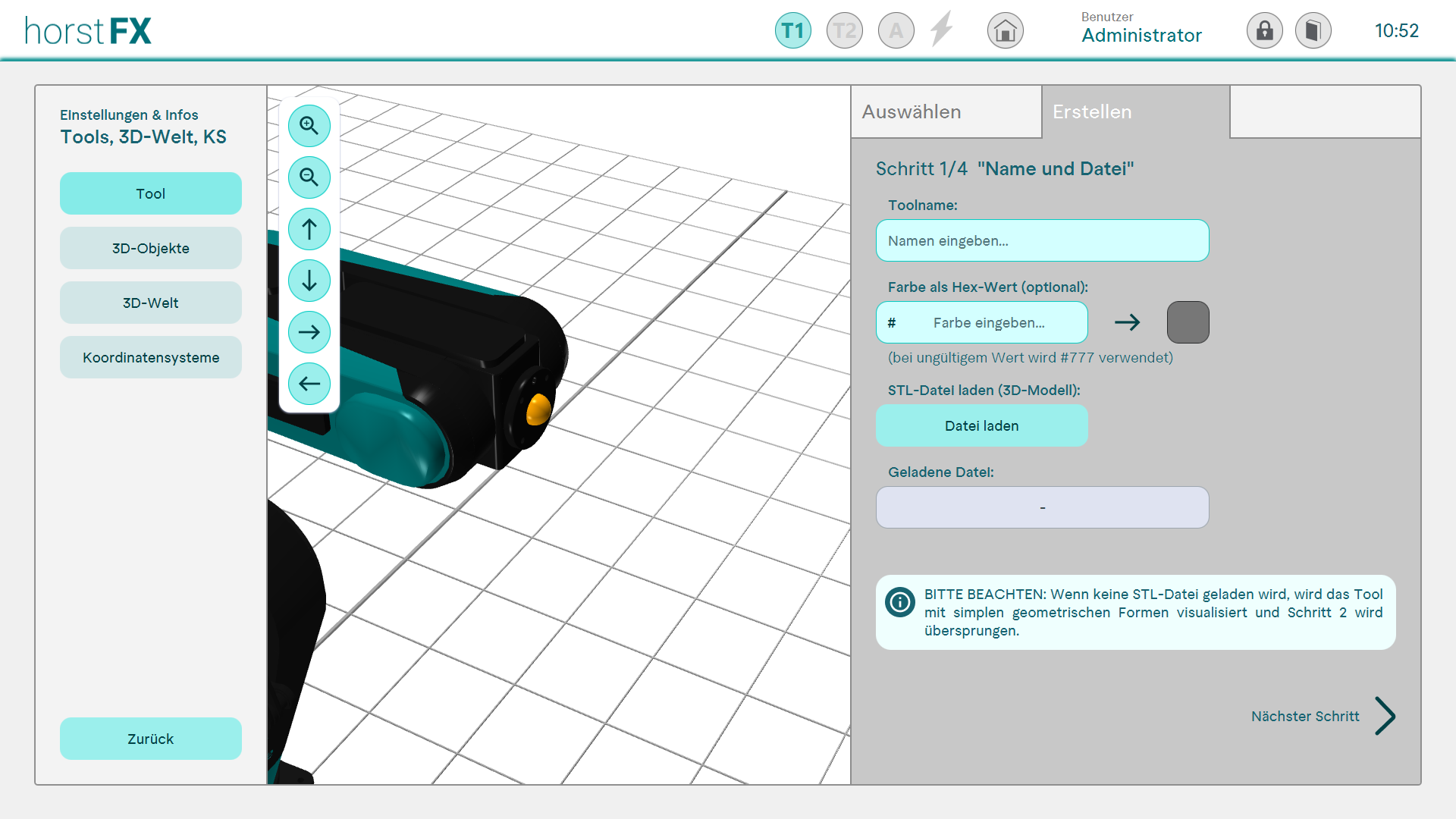 Um ein neues Tool zu erstellen, ist es nicht zwingend erforderlich eine STL-Datei zu importieren und zu laden. Wenn in diesem Schritt keine STL-Datei geladen wird, wird das Tool mit simplen geometrischen Formen visualisiert und Schritt 2 wird �bersprungen.