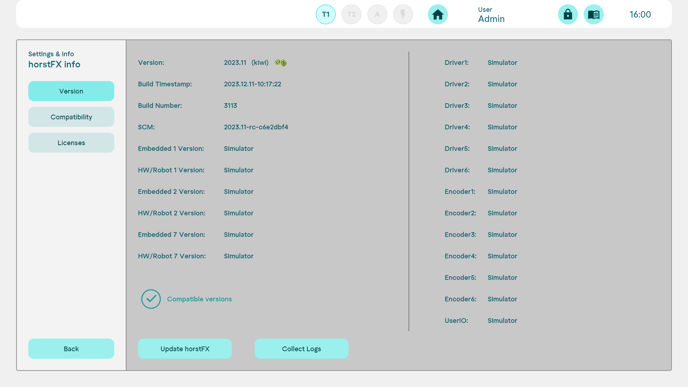 Information on individual versions of software and hardware components, changes with regard to downward compatibility and new functionalities as well as various licences can be found in the About horstFX info.