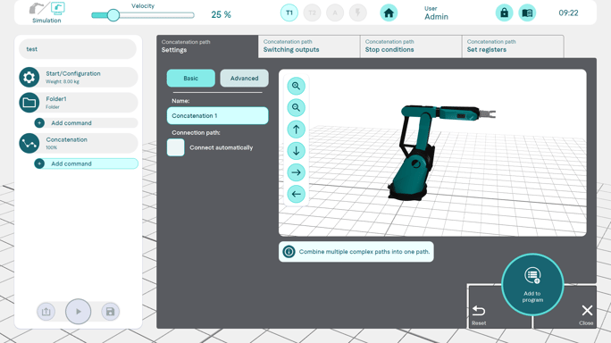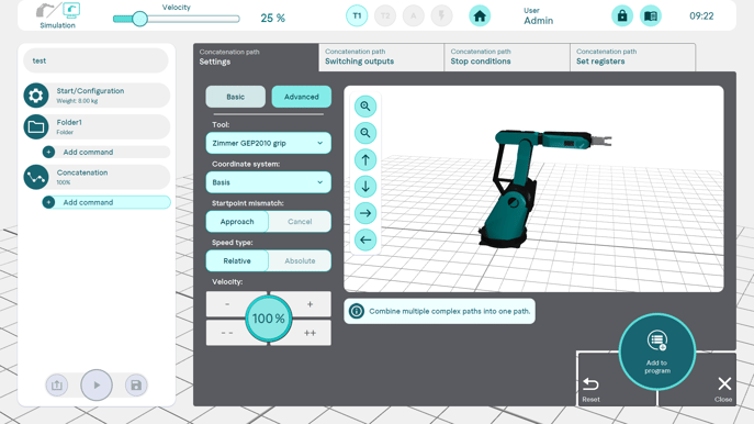 The tool and the coordinate system can also be set here. The behaviour can also be defined in the event of a different starting point, abort or start.
